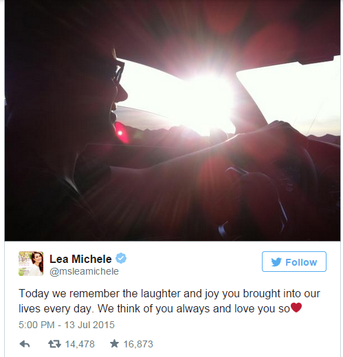Η τότε σύντροφός του και συμπρωταγωνίστρια του στοGlee,Lea Michele, έγραψε στο Twitter: