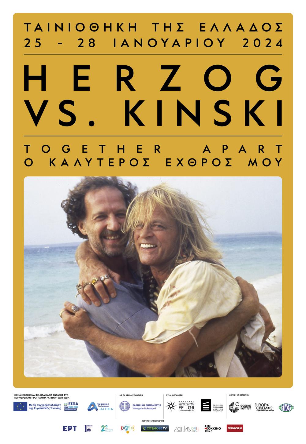 Η Ταινιοθήκη της Ελλάδος, η Ταινιοθήκη της Θεσσαλονίκης και το Φεστιβάλ Κινηματογράφου Θεσσαλονίκης, με την υποστήριξη του Ινστιτούτου Γκαίτε Θεσσαλονίκης (Goethe-Institut Thessaloniki),παρουσιάζουν το αφιέρωμα «Herzog vs. Kinski (Together apart - O καλύτερος εχθρός μου)» δίνοντας στο κοινό την ευκαιρία να απολαύσει τις εμβληματικές ταινίες που γέννησε η εκρηκτική συνεργασία ανάμεσα στον Βέρνερ Χέρτσογκ και τον Κλάους Κίνσκι, δύο από τις σπουδαιότερες μορφές στην ιστορία του ευρωπαϊκού σινεμά.