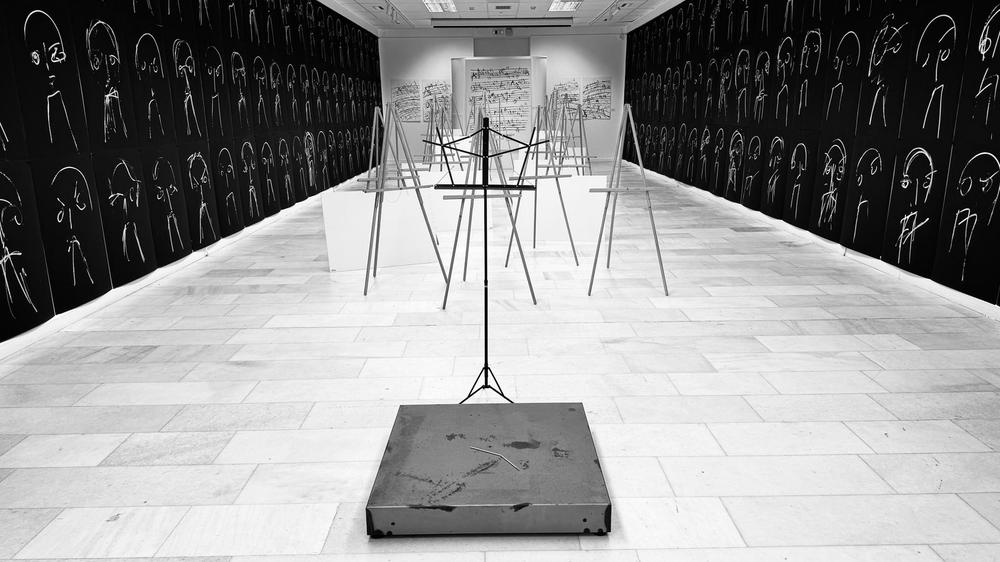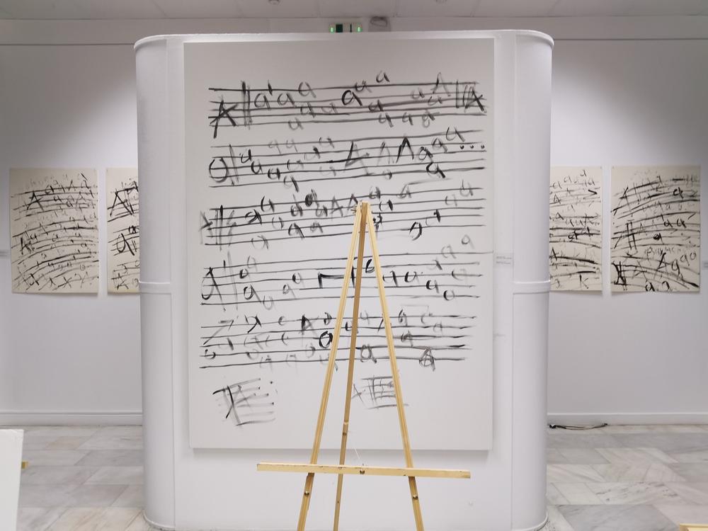 Το πολύπτυχο «Παύση» δείχνει ακριβώς την αντίδραση, τη διαμαρτυρία, αλλά και τις αντιθετικές φωνές που δονούν με παύση παγκόσμια τη δημόσια σφαίρα. Εδώ, συγκροτείται μια ενότητα ασυμμετρίας κι ασυμφωνίας, μιας ουσιαστικής δυσαρμονίας, καθώς οι νότες και οι φωνές στις παρτιτούρες δεν συντονίζονται με το κυρίως θέμα, αντιθέτως διαμεσολαβούνται από τη βούληση και την αρχή ενός παντοδύναμου μαέστρου. Παράλληλα, αποτελούν, ως παρτιτούρα, το εχέγγυο της οπτικοακουστικής μνήμης, του ίχνους μιας προσπάθειας να εκφρασθεί --και μέσω της μουσικής και ποιητικής αρμονίας-η υπερβατικότητα που επιτρέπει τη συνύπαρξη.