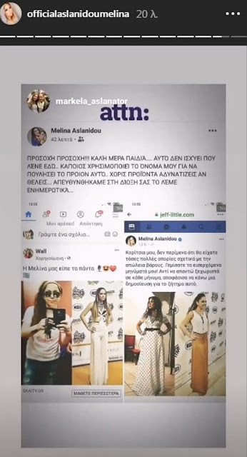 «Προσοχή, προσοχή! Καλήμερα παιδιά… Αυτό δεν ισχύει που λένε εδώ… Κάποιος χρησιμοποιεί το όνομα μου για να πουλήσει το προϊόν αυτό… χωρίς προϊόντα αδυνατίζεις αν θέλεις… Απευθυνθήκαμε στη Δίωξη σας το λέμε ενημερωτικά», έγραψε χαρακτηριστικά η Μελίνα Ασλανίδου στο Facebook.