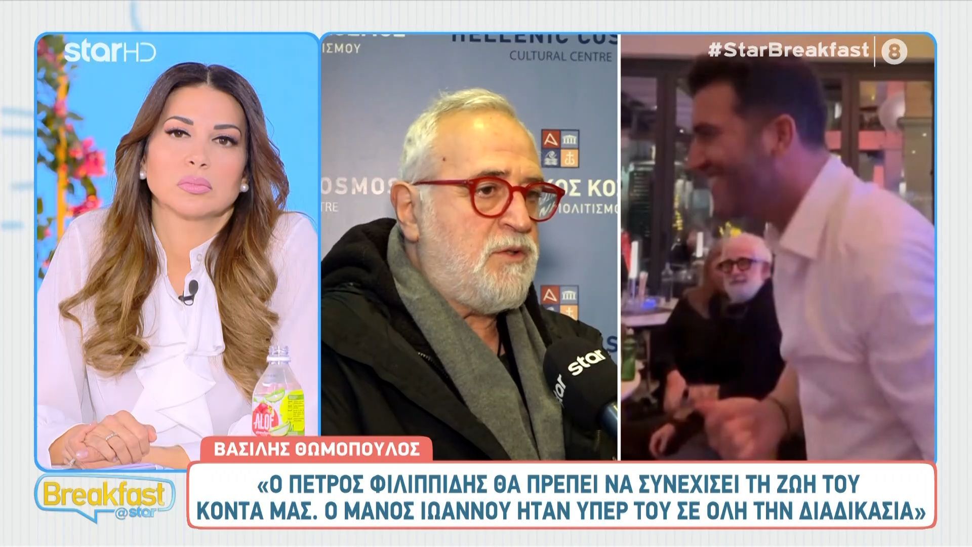 Στη συνέχεια, ο σκηνοθέτης αναφέρθηκε στον Πέτρο Φιλιππίδη και την πρόσφατη εμφάνισή του σε πάρτι γενεθλίων του Μάνου Ιωάννου. Ο κ. Θωμόπουλος δήλωσε ότι ο Πέτρος Φιλιππίδης θα πρέπει να συνεχίσει τη ζωή του κοντά μας, ενώ αποκάλυψε πως ο Μάνος Ιωάννου ήταν υπέρ του σε όλη τη διαδικασία. Υποθέτει ότι ο Φιλιππίδης τού το ανταπέδωσε με την παρουσία του στη γιορτή.