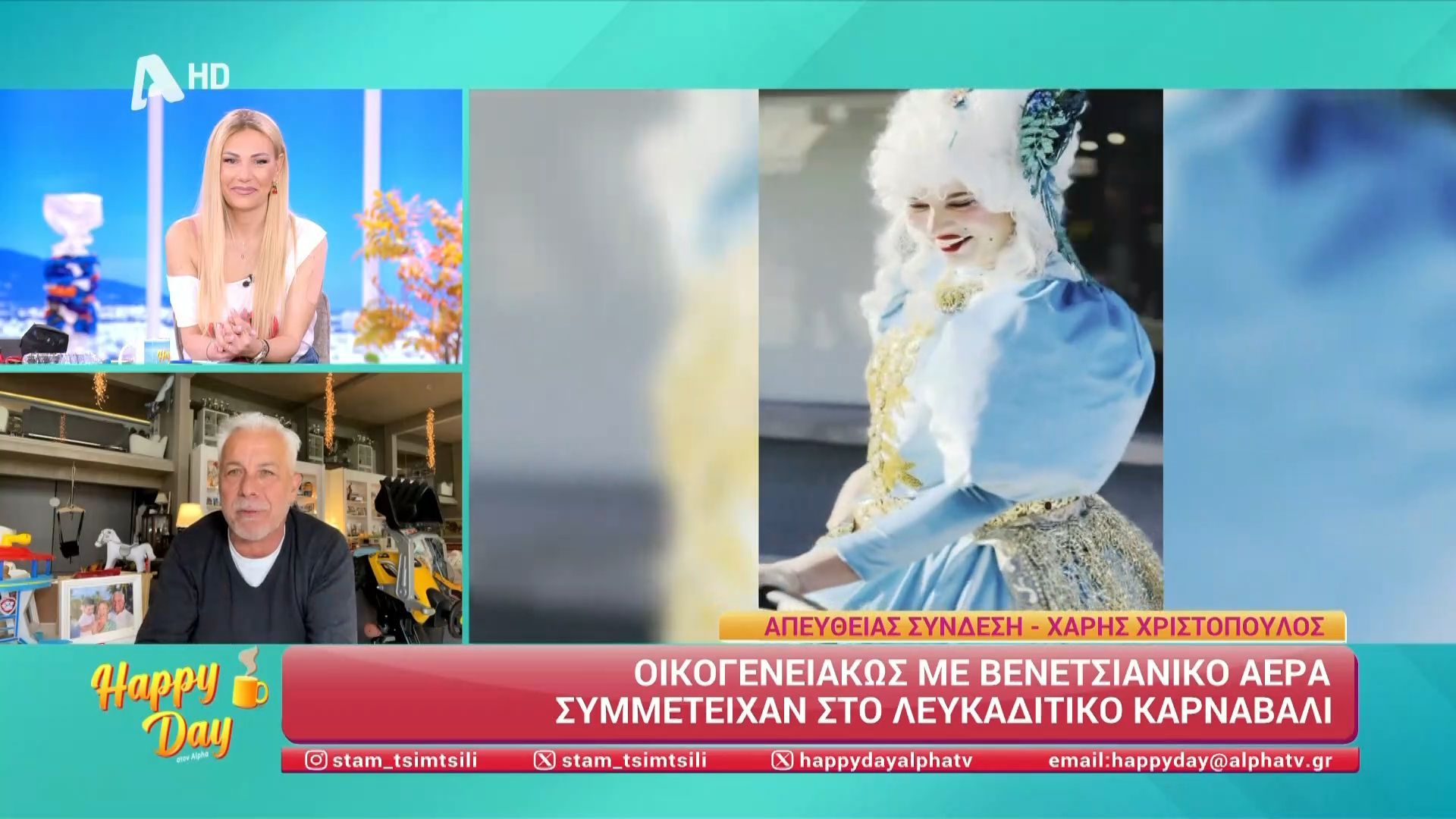 Ο Χάρης Χριστόπουλος μιλά στο Happy Day για τη συμμετοχή του στο καρναβάλι και τις όμορφες στολές.