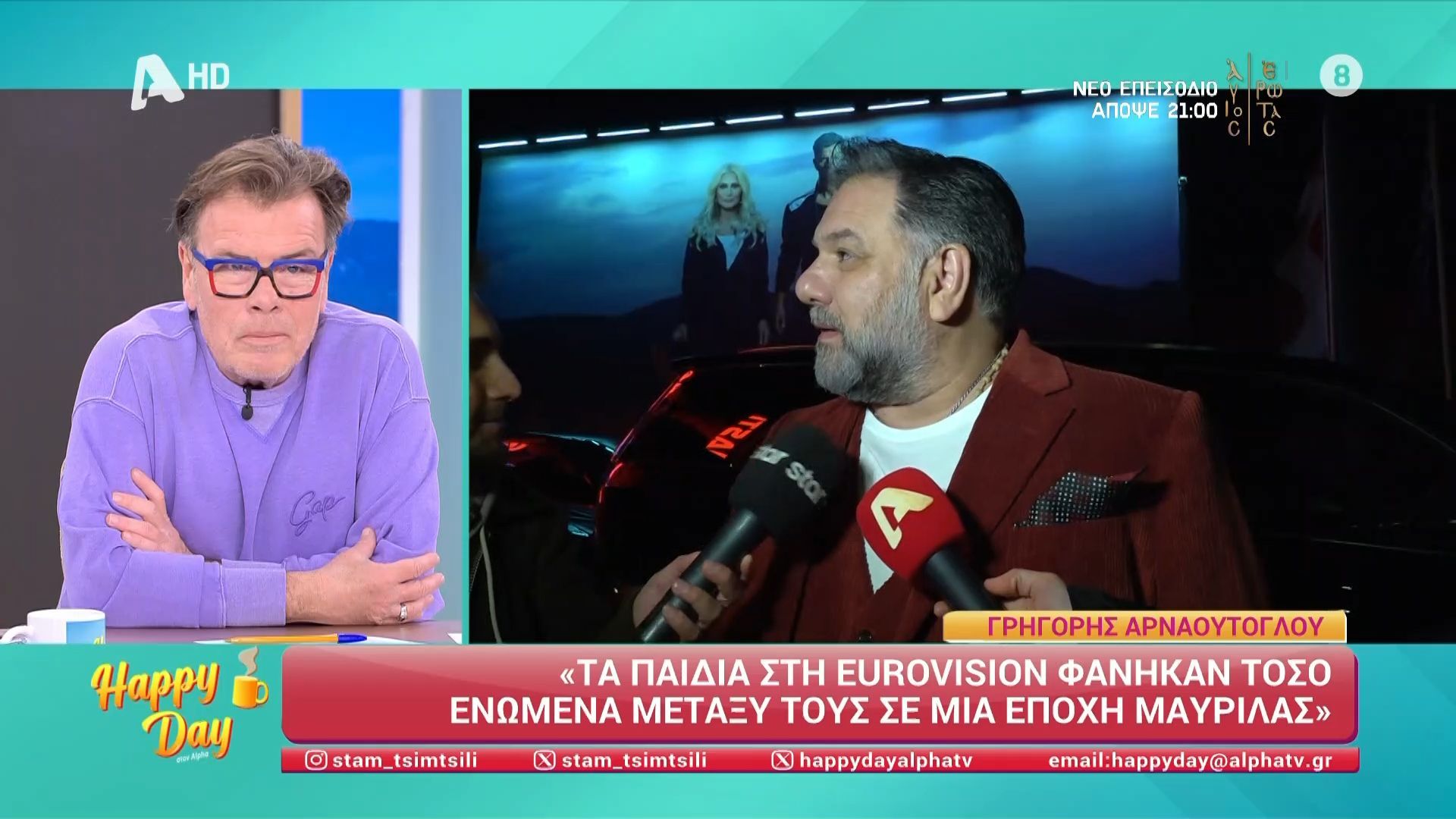 Η κάμερα του Happy Day βρέθηκε στην κοπή της πίτας του ANT1. Εκεί συνάντησε μεταξύ άλλων και τον Γρηγόρη Αρναούτογλου, ο οποίος αναφέρθηκε στη Eurovision και τον Akyla.