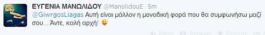 Σαν «βόμβα» έσκασε η είδηση πως η Ευγενία Μανωλίδου και ο Γιώργος Λιάγκας θα παρουσιάζουν μαζί καθημερινή ραδιοφωνική εκπομπή αυτή τη σεζόν στα Παραπολιτικά.Δείτε την απάντηση της γνωστής μαέστρου στο tweet του επιτυχημένου παρουσιαστή,ο οποίος έγραψε: