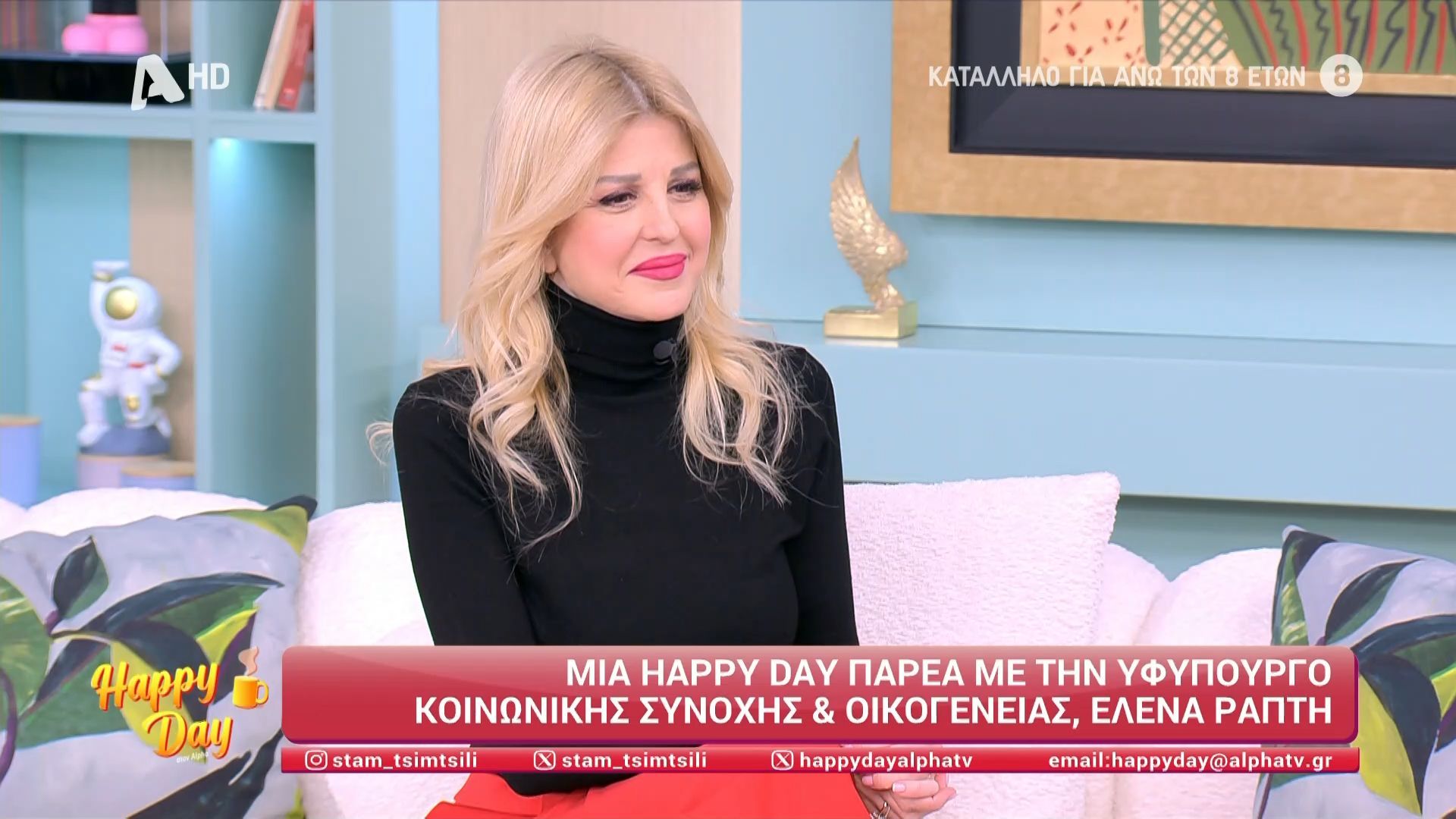 Η Έλενα Ράπτη, Υφυπουργός Κοινωνικής Συνοχής και Οικογένειας βρέθηκε καλεσμένη στο Happy Day και αναφέρθηκε στο πρόγραμμα "Νταντάδες της γειτονιάς", στην προσωπική της ζωή και τα προβλήματα υγείας που αντιμετώπισαν με τον σύζυγό της και στην παιδική σεξουαλική κακοποίηση.
