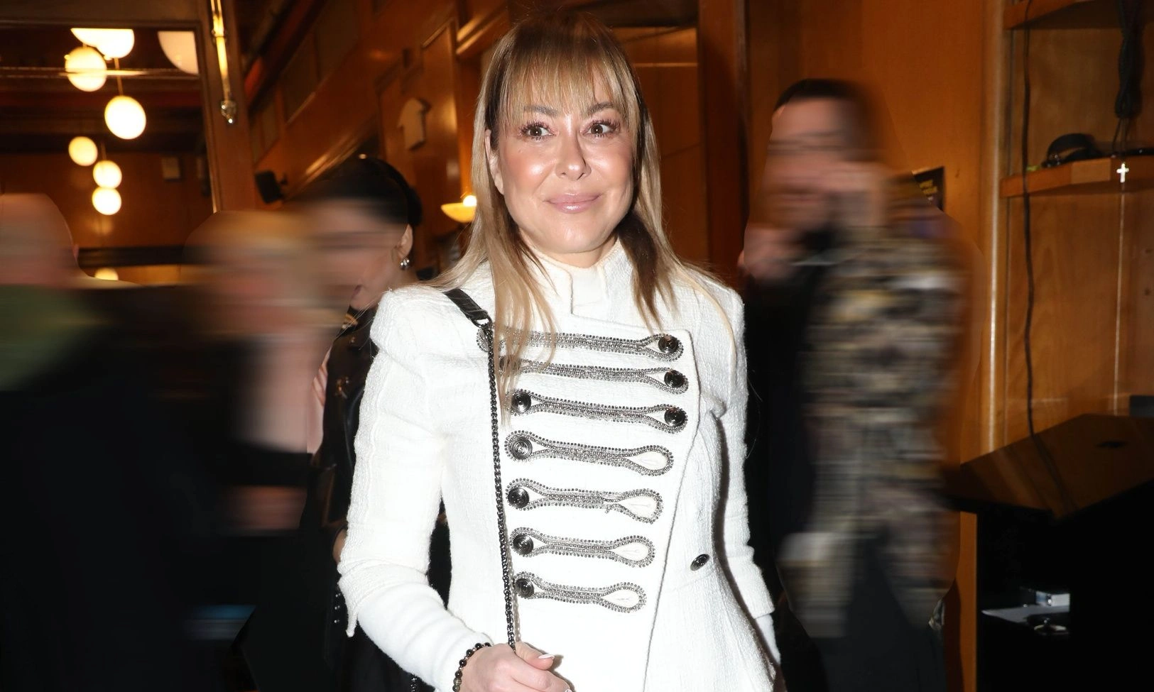 Η Μελίνα Ασλανίδου επέλεξε να «σπάσει» το αυστηρό ύφος του σακακιού με ένα πιο glam αποτέλεσμα. Το συνδύασε με γκρι τζιν παντελόνι με διακριτικές παγιέτες, δημιουργώντας μια ενδιαφέρουσα ισορροπία ανάμεσα στο military ύφος και τη μοντέρνα λάμψη. Το σύνολο ολοκληρώθηκε με μαύρα ankle boots και μια μικρή crossbody τσάντα.