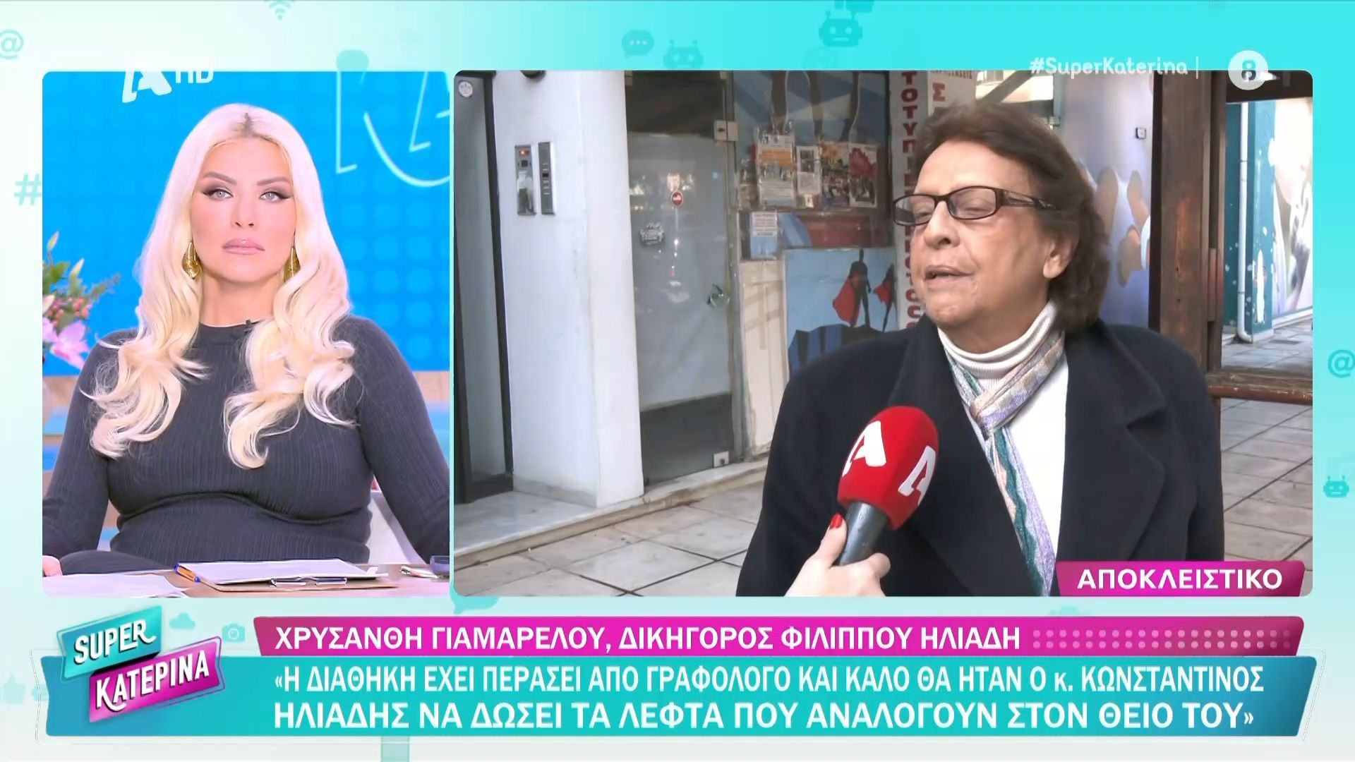 Από την πλευρά της, η Χρυσάνθη Γιαμαρέλου, δικηγόρος του Φίλιππου Ηλιάδη, απαντά στις κατηγορίες, τονίζοντας ότι ο εντολέας της είναι κληρονόμος, ανεξάρτητα από τις επιθυμίες της αντίδικης πλευράς. Η κυρία Γιαμαρέλου υποστηρίζει ότι η διαθήκη είναι πλαστή και μπορεί να προσκομίσει όλα τα έγγραφα που το αποδεικνύουν, καθώς έχει ήδη περάσει από γραφολόγο. Καλεί τον Κωνσταντίνο Ηλιάδη να σταματήσει τις δηλώσεις στα κανάλια και να δει την πραγματική κατάσταση, προτείνοντας να βρει μια λύση με τον θείο του και να του δώσει τα χρήματα που του αναλογούν. Σημειώνει επίσης ότι η Καίτη Γκρέυ στο βιβλίο της αναφέρεται μόνο στον γιο της Φίλιππο.