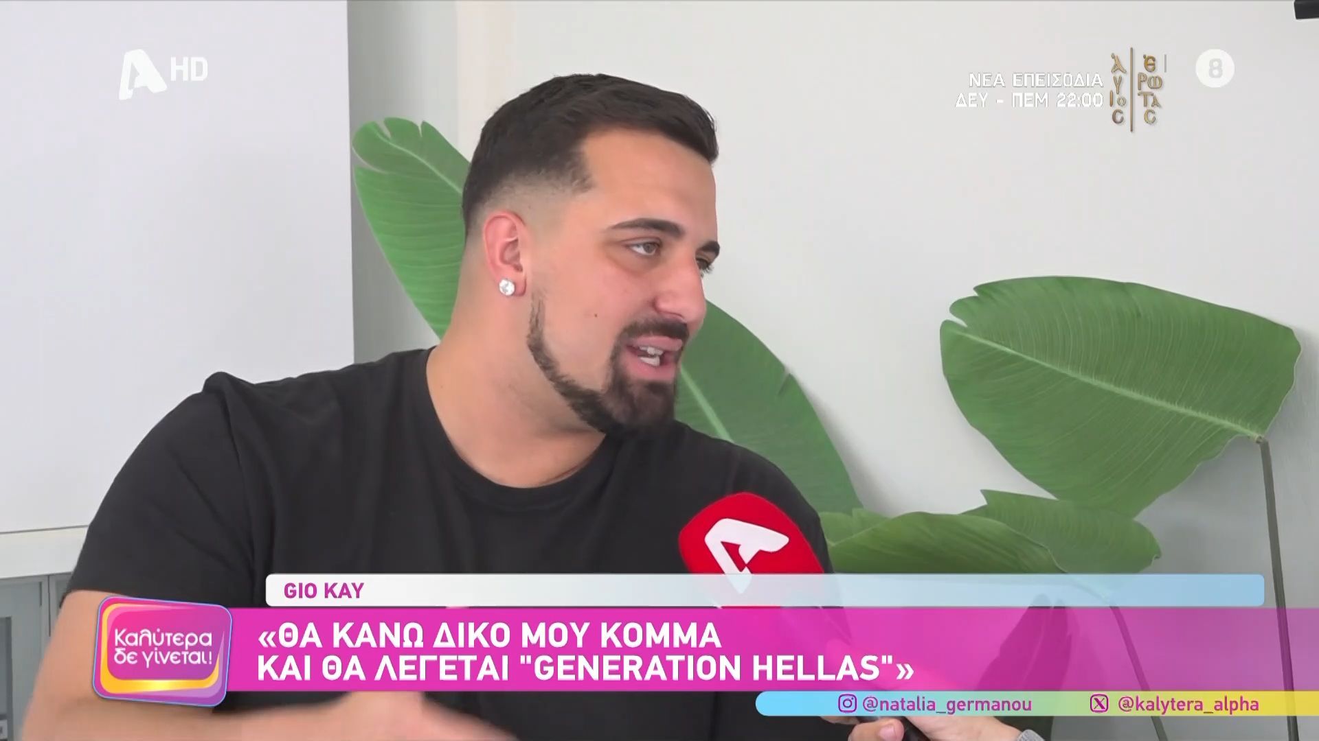 Ο Gio Kay, σε μια εφ' όλης της ύλης συνέντευξη στην εκπομπή «Καλύτερα δε γίνεται», αποκάλυψε πτυχές της ζωής και των φιλοδοξιών του. Ο γνωστός καλλιτέχνης ανέφερε ότι η εταιρεία του απασχολεί πάνω από 200 καλλιτέχνες, ενώ μοιράστηκε την αγάπη του για την αρχαία Ελλάδα, την ιστορία και τη μυθολογία, τονίζοντας πως πήγε σε ελληνικό σχολείο στην Αμερική για έξι χρόνια και λάτρευε τον Αριστοτέλη ως παιδί.