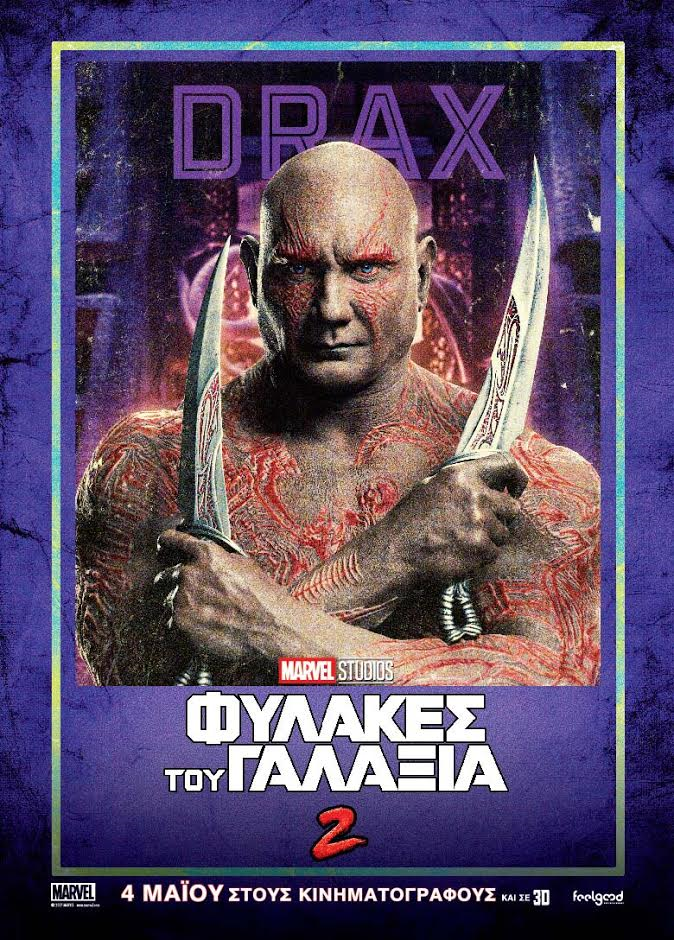 Ο Dave Bautista επιστρέφει στον ρόλο του σωματώδη, γεμάτου τατουάζ Drax. Είναι ένας περίπλοκος χαρακτήρας, εξίσου απειλητικός όσο και αξιαγάπητος, σε πλήρη άγνοια της εξωφρενικά αφελούς προσέγγισης που έχει για τη ζωή. «Νομίζω ότι το κοινό αγάπησε τον Drax γιατί τον ένιωσε» εξηγεί ο παραγωγός Jonathan Schwartz. «Παίρνει τα πάντα κυριολεκτικά και δεν έχει χιούμορ, που κάνει ό,τι λέει αστείο. Θα τον δούμε να εξελίσσεται και να κάνει ό,τι μπορεί για να μην είναι τόσο μονοσήμαντος. Δεν τα πολύ-καταφέρνει, κι αυτό του δίνει μια ακόμα διάσταση σε ό,τι κάνει». Ο Bautista εξηγεί χαρακτηριστικά ότι «ο Drax είναι το όχημα για το πνευματώδες και ελαφρά διεστραμμένο χιούμορ του Gunn».